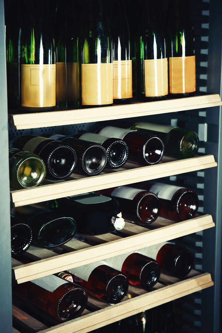 O ideal é escolher uma adega climatizada com prateleiras ou gavetas basculantes.