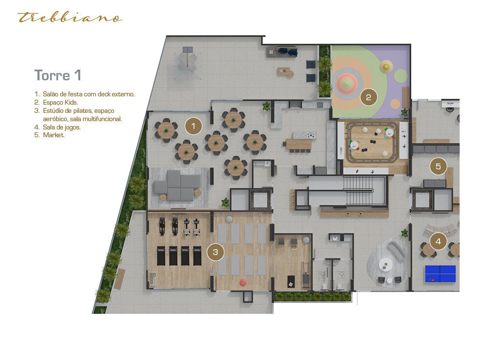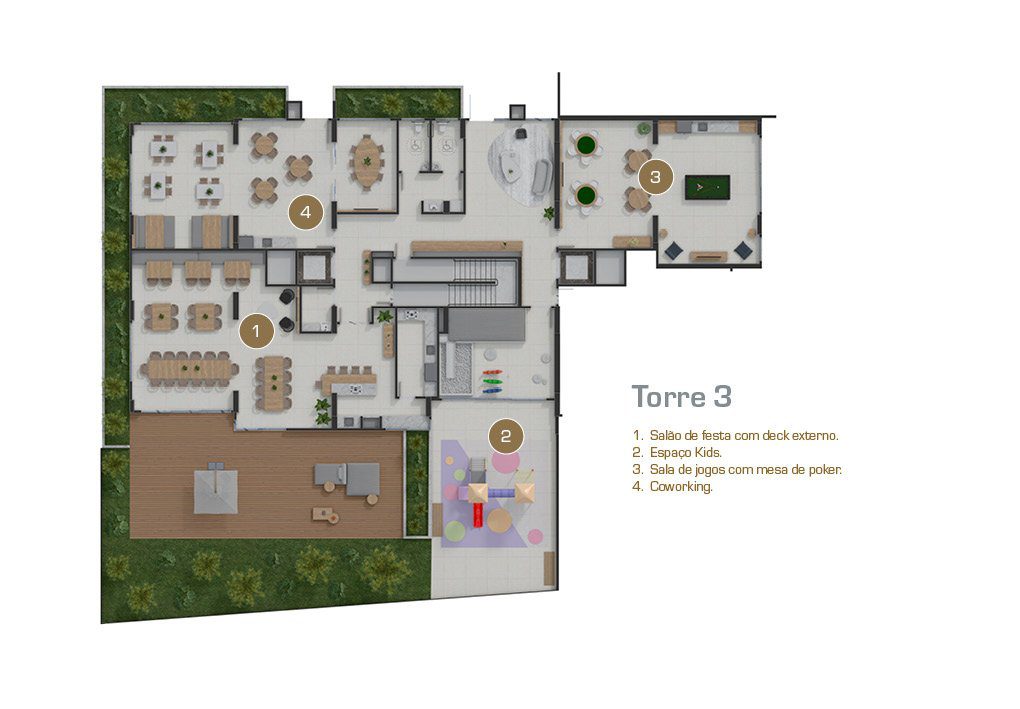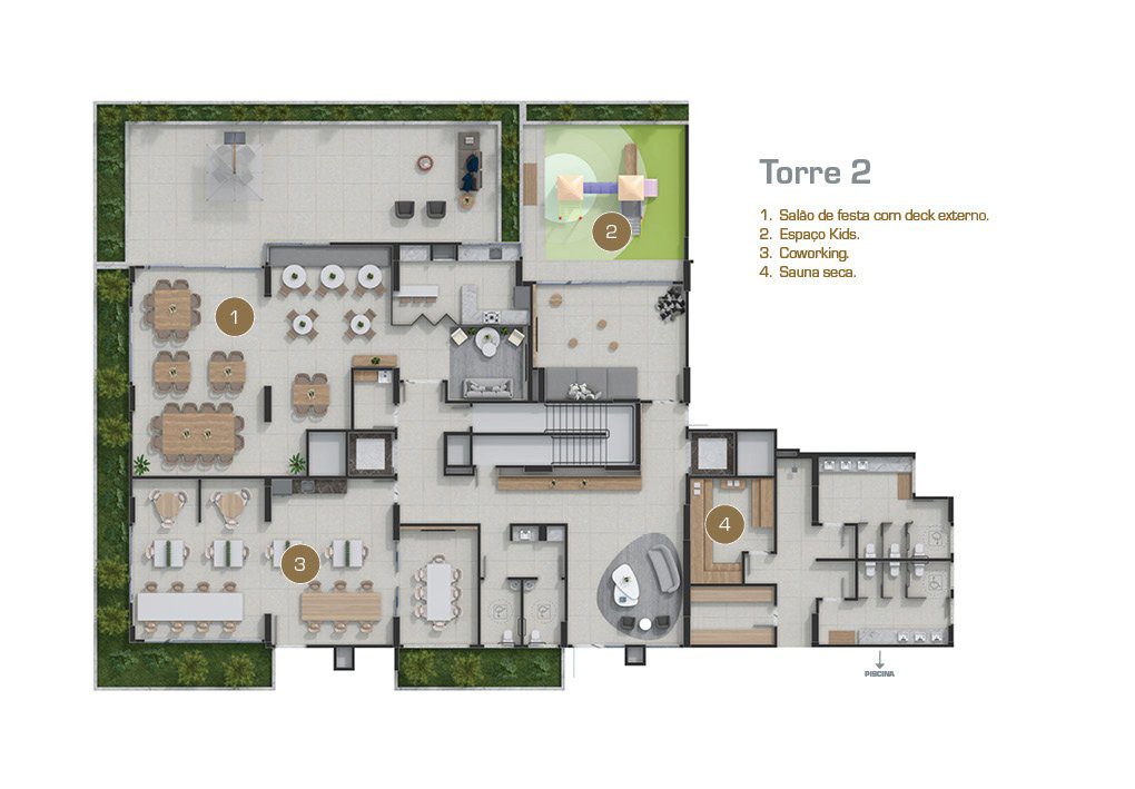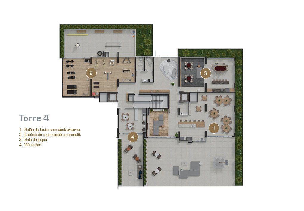 Serviços e facilidades: área de coworking, market place, delivery spot e muito mais.