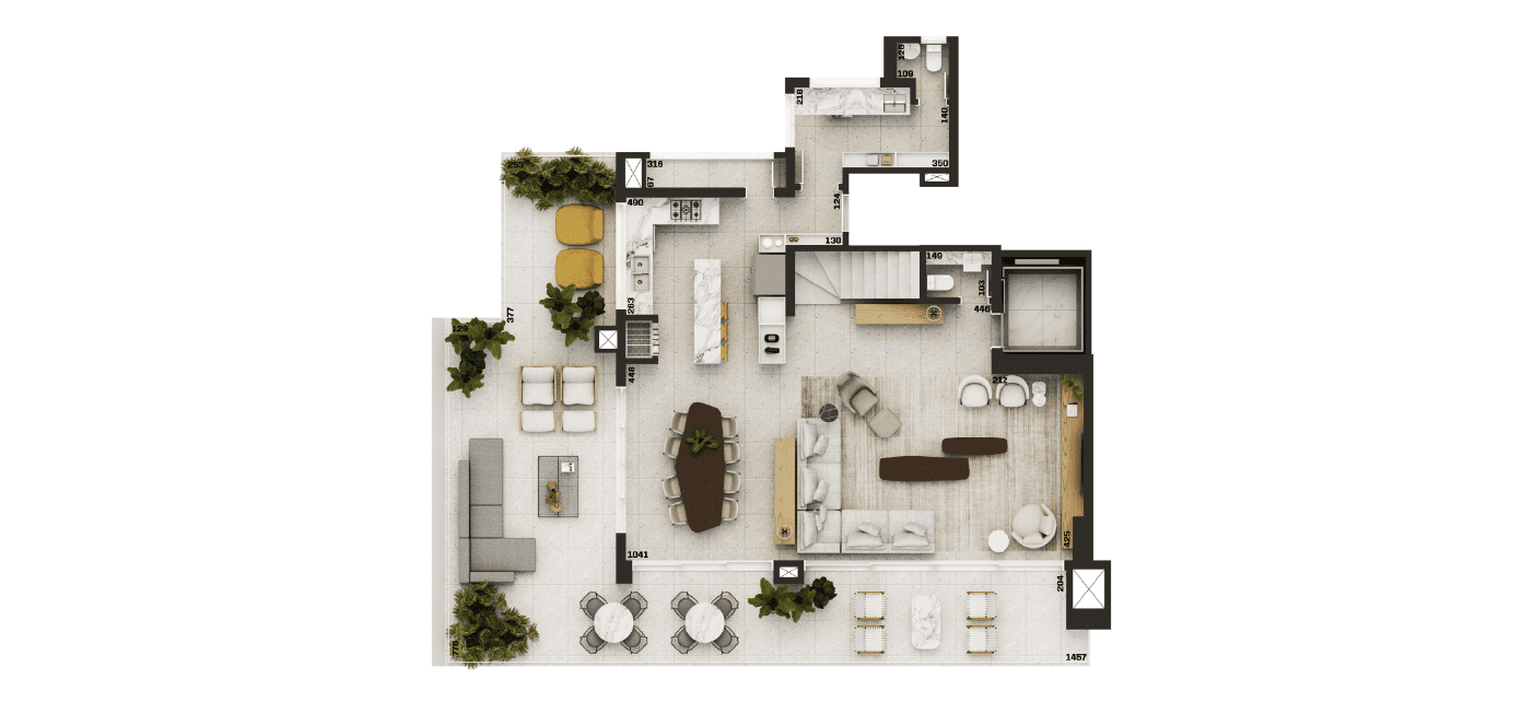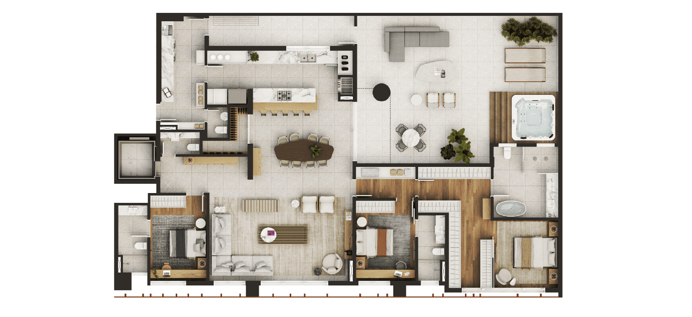 Nas áreas privativas, o projeto surpreende com o melhor 230m² do segmento, resultado de uma distribuição inteligente que privilegia amplitude, circulação e integração entre os ambientes. Cada metro quadrado foi pensado para oferecer o máximo de funcionalidade, beleza e conforto.